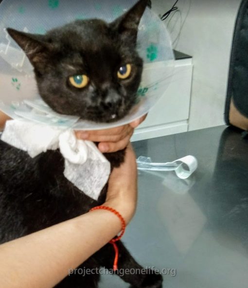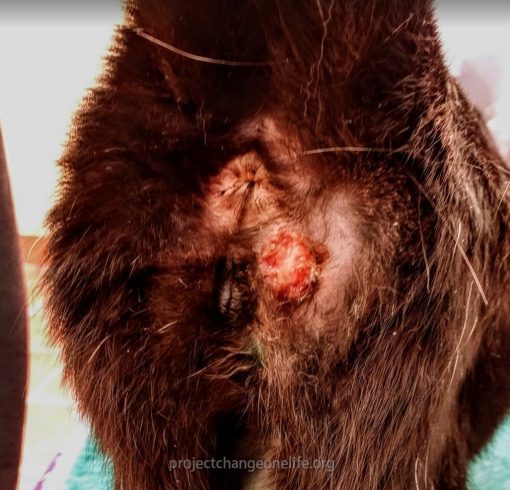 FeLV+ rescue Negrita rushed to the vet hospital after a large infected wound was found in her anal area. She was diagnosed with an anal gland infection.
