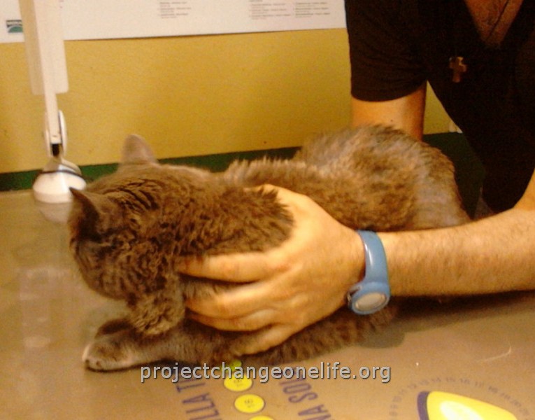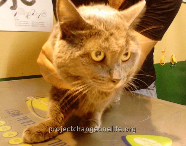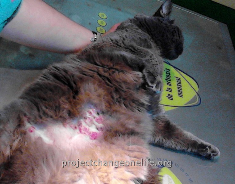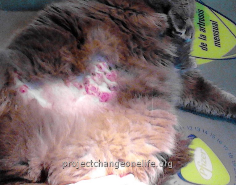 Sofia’s family (the rescue we had spayed last month) came to us again asking for help, this time for their senior cat, Puffy (16). Puffy was diagnosed mammary cancer a few years ago and at the time a few tumors were surgically removed however due to the fact that her family has a very limited income, they could not afford to keep up with treatment and after some time Puffy started to show alarming signs again. Her abdomen is now full of ulcerations and she also has breathing difficulties so we immediately rushed her to the vet to get help.
