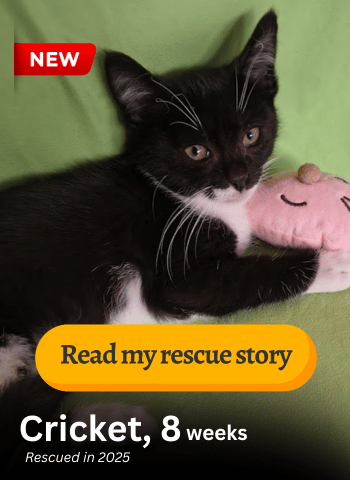 Cricket, 8 weeks old – Sick feral kitten. Diagnosed with a severe case of FVR. Found in distress in his colony. Rescued in November 2025.