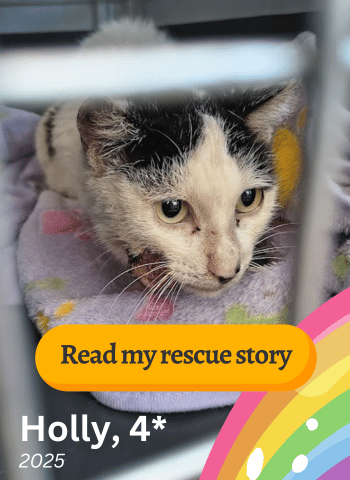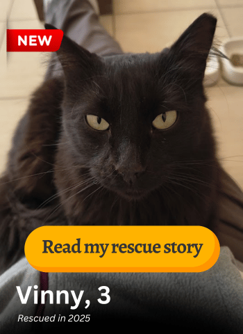 Cheeky, 2 – Orphaned kitten 4 weeks old. Found starving and in distress. Fed outside the Sanctuary for 4 months. Rescued in November 2023.
